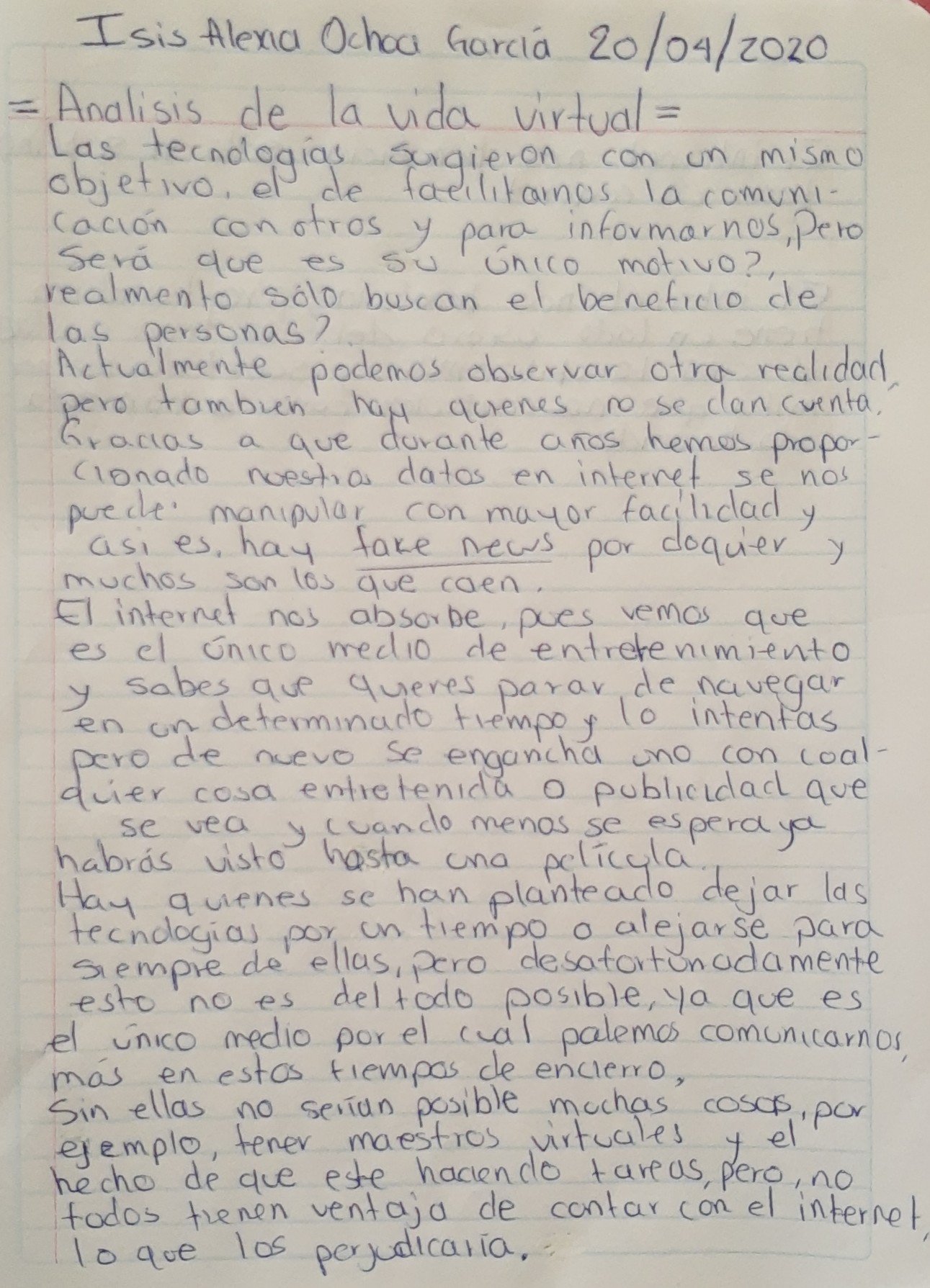 Nuestra vida afuera es de rutinas, es claro que este cambio tan repentino nos haya afectado unos más que a otros. Nos pone barreras físicas y en un punto podemos llegar a la desesperación por el ritmo al que acostumbramos, pero también nos damos cuenta de algo que tal vez en el exterior no conoceríamos de nosotros, la adaptación y manera de buscar y encontrar soluciones de supervivencia. Somos fuertes , podemos sobrellevar estás circunstancias.